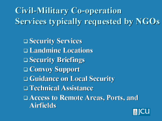 The military can provide a range of services to NGOs in the field, which would be otherwise quite difficult to source privately. |