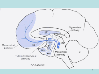 | DOPAMINE (DA) The distribution of DA in the brain is more restricted that NA. A large proportion of DA content of the brain is found in the corpus striatum (a part of the extra pyramidal motor system concerned with coordination of movement), in certain parts of the limbic sys tem and in the hypothalamus. DA-ergic pathways in the CNS DA-ergic neurons form 3 main system. About 75% of the DA in brain , occurs in the nigrostriatal pathway, with cell bodies in the substantia nigra and the axons terminating in the corpus striatum (Fig.2). These fibers run in the medial forebrain bundle along with many NA and 5-HT-containing fibers. The second important system is the mesolimbic/ mesocortical pathway, whose cell bodies occurring in groups in the midbrain with fibers projecting, also via the medial forebrain bundle, to parts of the limbic system, especially the nucleus accumbens and amygdaloid nucleus and to the cortex. Finally, the tuberohypophyseal system is a group of short neurons running from the arcuate nucleus of the hypothalamus to the median eminence and pituitary gland, the secretion of which they regulate. There are also many local DA-ergic interneurons in the olfactory cortex and medulla, and in the retina (Fig.2). |