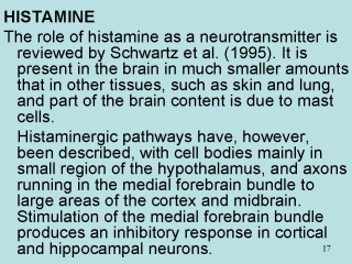 effects, via H1, H2 and H3 receptors all of which are typical G-protein coupled receptors. H1- receptors are coupled to phospholipase C, and prodice mainly excitatory effects, whereas H2- receptors act cAMP formation, and are mainly inhibitory. H3- receptors serve as inhibitory autoreceptors on histaminergic neurons. The role of histamine in the CNS is poorly understood. Blocking H1- receptors causes sedation and also has antiemetic effect. |