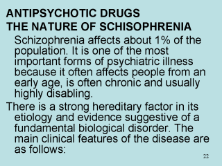 symptoms: Delusions (often paranoid in nature) Hallucination, usually in form of voices, and often exhortatory in their message Thought disorder, comprising wild trains of thought and irrational conclusions, often associated with the feeling that thoughts are inserted or withdrawn by an outside agency. “Negative” symptoms: Withdrawal from social contacts Flattening of emotional responses. |