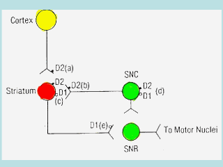 pathway. (c), both D1 and D2 receptors are located on the cell bodies of the nigrostriatial