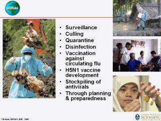 prevented? No one knows with certainty. The only guaranteed way would be to eliminate virus from the bird population globally – a task that is unachievable in the near future. Thus, being proactive is perhaps the best strategy. It is critical to develop: -A complete and comprehensive understanding of the past pandemics -A through preparedness plan -An excellent surveillance and logistical capacity Strategies: -To enforce movement restrictions in and out of the affected area -For quarantine -Culling -Disinfection To increase the likelihood that early intervention using the WHO rapid-intervention stockpile of antiviral drugs will be successful (currently WHO has antiviral medications, sufficient for 3 million treatment courses) These drugs could be used prophylactically near the start of a pandemic to reduce the risk that a fully transmissible virus will emerge or at least to delay its international spread, thus gaining time to augment vaccine supplies. Vaccine development Global coordination Mass education |