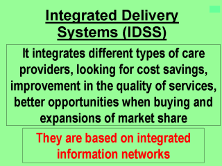 Integrated delivery systems (IDSs) allow the integrating of different health care providers into one organization in order to share risks, enhance the type of services offered to clients, implement cost savings, market expansion, simplification, a bigger scale of operations and provide better options to clients. It is not a merger, because they pool information technology while pursuing independent business goals. |