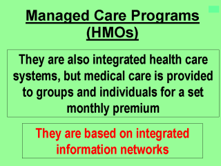 (HMOs) are another way of integrating different types of health care providers. One of