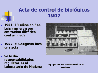 Congreso en 1902 pasara el Acta de Control de Biológicos que
