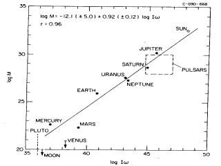 of astronomical objects, as labeled, vs. their angular momenta Iω.