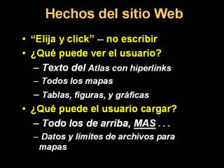 | Todo en este sitio Web puede realizarse a través de clicks en el ratón. El usuario puede ver todo el texto, mapas, figuras y gráficas contenidas en el Atlas. El usuario puede también cargar mapas, figuras, datos y límites geográficos de archivos usados para crear los mapas. |