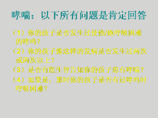 哮喘的标准(“曾患有哮喘”)是以下所有问题得到肯定回答(1)你的孩子是否发生过使他/她呼吸困难的哮鸣?(2)你的孩子像这样的发病是否发生过两次或两次以上?(3)是否有医生曾告知你的孩子患有哮喘?(4)如果是,那时你的孩子是否有过哮鸣时呼吸困难?没患过哮喘的对象包括回答一个,两个或三个定义哮喘问题的儿童被作为对照组。