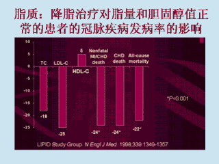 (83% men, 17% women) 年龄: 55-67 yr Median baseline TC: 218 mg/dL Median baseline LDL-C: 150 mg/dL 持续时间: 6 yr 干涉: Pravastatin (40 mg/day) |