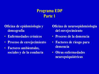 de epidemiología, demografía y biometría Oficina de Epidemiología y Demografía--Jack Guralnik, M.D., Ph.D. La oficina de Epidemiología y Demografía planea y conduce estudios sobre: Enfermedades crónicas y sobre el status funcional y discapacidad en la población anciana. La distribución epidemiológica y determinantes de enfermedades específicas como la enfermedad coronaria. Las consecuencias de la enfermedad, especialmente los efectos de enfermedades crónicas sobre las limitaciones funcionales y la capacidad de permanecer independiente en la comunidad. Los roles de los factores de riesgo de conducta, psicosociales y demográficos en el desarrollo de enfermedad y discapacidad. Oficina de Neuroepidemiología del envejecimiento -- Lenore Launer, Ph.D. La Oficina de Neuroepidemiología fue establecida en 1999. Los esfuerzos del primer año se enfocaron en formular estudios a profundidad de los mecanismos seleccionados hipotetizados que tienen un rol en la neurodegeneración; desarrollando las propuestas de investigación sobre la función cerebral en un estudio de susceptibilidad genética e interacción ambiental-genética en condiciones de salud comunes a la edad avanzada; y desarrollando análisis e iniciando nuevos proyectos usando datos existentes y especimenes biológicos. Diferentes marcadores de neurodegeneración han sido estudiados para mejorar el entendimiento de la consistencia e impacto de varios factores de riesgo sobre enfermedad cerebral. |