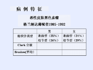 只有36%的病例黑色素瘤厚度超过1.5mm。30%的临床资料没有提供这项数据。平均厚度是2.77mm,数值范围为0.2到15mm。肿瘤平均厚度男女不同,男性为3.3mm,女性为2.4mm。