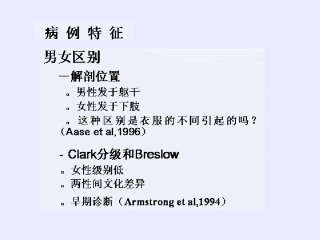 性别差异不但显著影响发病率,对解剖位置也有影响。男性黑色素瘤好发于躯干,而女性好发于下肢。这种差异也许是由于对于阳光暴露程度不同。女性腿部常暴露于外而男性躯干常暴露于外。