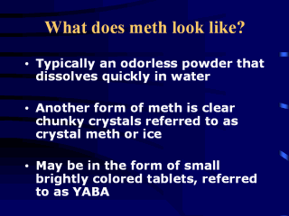 can be a clear chunky crystal, which is referred to as crystal meth or ice.