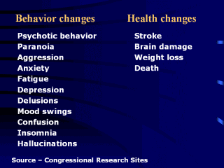 long-term effects can occur. Behavior changes could include psychotic behavior, paranoia, aggression, anxiety, fatigue, depression, delusions, mood swings, confusion, insomnia, and hallucinations. An amphetamine-induced psychotic disorder often mimics schizophrenia, because people with both conditions often experience auditory, visual, and tactile hallucinations. Health dangers include stroke, brain damage similar to Alzheimer’s disease, weight loss, and death. (For more information on methamphetamine psychosis, go to http://www.rnceus.com/meth/methpsych.html.) |