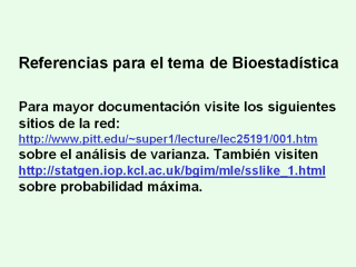 Existe una gran cantidad de excelentes artículos sobre bioestadística y están disponibles, como las lecturas en “Supercourse.” Existe disponible un curso completo por M Zelen, zelen@hsph.harvard.edu que incluye el tema de epidemiología y consta de: 2. Elements of Laplace transforms. (1) 3. Relations between incidence, prevalence and time with disease. La distribución exponencial de espaciación normalizada, el Teorema de Campbell, sumas al azar de variables exponenciales, procesos de conteo y la distribución exponencial, sobre posición a los procesos de conteo, apertura o separación y los componentes de procesos, y los procesos no – homogéneos de Poisson. (2) Definiciones, asíntotas, función de renovación, procesos de renovación del equilibrio. Procesos puros en eventos de nacimientos (procesos de Yule-Furry), generalizaciones sobre el procesado de datos de nacimiento y muerte, relaciones en la cadena de Markov, procesos lineales de los procesos de nacimiento y muerte. Léase Feller (1960). Introducción, ecuaciones de Chapman-Kolmogorov, procesos de ramificación, equilibrio estadístico, clasificación de estados. Ver de nuevo a Feller (1960). Ecuaciones maestras, momentos, problemas de tiempo en primer paso. Este curso también contiene: 1. Examples and Elements of Theory 3. Independence and Urn Sampling 5. Proportional Hazards Models and Urn sampling 6. Multiple Logistic Regression Asegúrese de completar el programa de acceso gratuito EPI de NIH |