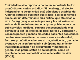 | Como ya se señaló, las creencias y actitudes culturales pueden adicionalmente a contribuir a la sobrevida de pacientes de minorías en desventaja (23). El efecto de creencias culturales, costumbres y normas de la calidad de una persona en la experiencia de sobrevivir es un área virtualmente inexplorada. |
