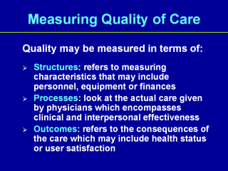 care can be measured in terms of structures, processes, and outcomes. Our