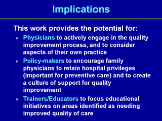 feedback that will guide quality improvement initiatives. Policy-makers should strongly consider the benefits of family physicians retaining their hospital privileges, as well as structuring programs for better, broader tracking such as electronic medical records. They must also create a culture of support, integral to any quality improvement initiative. Trainers and educators can use indicators to focus educational initiatives on areas that are in need of quality improvement and can provide ongoing training to practicing physicians. These opportunities can focus on areas that are in need of quality improvement. |