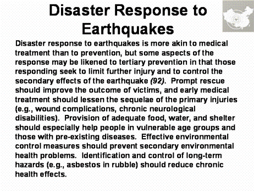 Because rapid rescue of trapped victims and prompt treatment of those with life-threatening injuries can improve their outcome, early rapid assessment of the extent of damage and injuries is needed to help mobilize resources and direct them to where they are most needed (110).  Unfortunately, the very factors likely to cause large numbers of injuries are also likely to disrupt communications and transportation and to damage medical-care facilities.  Public health officials need to establish in advance how the affected areas will be surveyed (see chapter on Surveillance and Epidemiology [Chapter 3]).