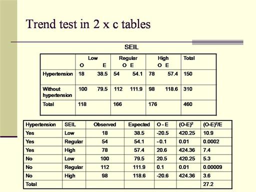 Chi-squared test without correct is 27.20 with 2 degree of freedom p<0.001. How can we interpret this result? We have interest in if the proportion of people with hypertension increase or diminish through the SEIL groups. To answer this, we need a Chi-squared test for trends. |