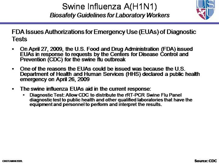 FDA authorizes emergency use of influenza medicines, diagnostic test in response to swine flu outbreak in humans [news release]. Rockville, MD: U.S. Food and Drug Administration. April 27, 2009. http://www.fda.gov/bbs/topics/NEWS/2009/NEW02002.html. Accessed April 28, 2009.