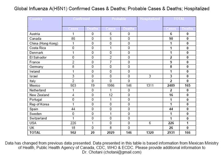 يوضح الجدول حالات انفلونزا (H1N1) A المؤكدة والوفيات، الحالت المحتمة والوفيات ، وادخالت المستشفىيات في العالم
