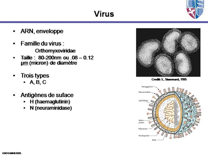 | Les antigènes internes (protéines M1 et NP ) sont les protéines spécifiques de type (antigènes spécifiques de type) utilisés pour déterminer si un virus donné est de type A, B ou C. Les protéines M1 de tous lesmembres de chaque type ont des réactivités croisées. Les protéines NP de touq les membres de chaque type ont aussi des réactivités croisées. Les antigènes externes (HA and NA) montrent plus de variation et représentent les sous-types d’antigènes et leur puissance spécifique. Ils sont utilisés pour déterminer la puissance particulière d’une grippe A responsable d’une épidémie. Les agents grippaux sont nommés en fonction de leurs types d’hémaglutinine et de neuraminidase des protéines de surface, par exemple, ils seront appelés H3N2 pour les hémaglutinines de type 3 et de neuraminidase de type 2. Si deux agents grippaux infectent la même cellule en même temps, leurs capsules protéiques et leurs enveloppes lipidiques sont éliminées, exposant leur ARN qui est alors trancrit à l’ ARMm. La cellule hôte forme alors de nouveaux virus qui combinent plusieurs antigènes: par exemple H3N2et H5N1 peuvent donner de cette manière H5N2. Comme le système immunitaire humain a du mal à reconnaître le nouvel agent viral, celui-ci peut être très dangereux.