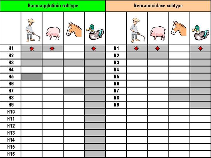 | Les Virus de la Grippe A sont retrouvés dans de nombreuses espèces animales, comme les canards, les poulets, les porcs, les baleines, les chevaux et les phoques . Il existe 16 sous types différents d’ hémaglutinine et 9 sous types différents de neuraminidase, tous ayant été retrouvés dans les virus de la grippe A chez les oiseaux sauvages. Les oiseaux sauvages sont le premier réservoir naturel pour tous les sous-types de virus de la grippe A et l’on pense qu’ils sont la source des virus de la Grippe A pour tous les autres animaux. La plupart des virus grippaux provoquent une infection modérée ou asymptomatique chez les oiseaux; mais cette symptomatologie varie énormément,dépendant de la puissance du virus. L’infection avec certains virus de la grippe aviaire A ( par exemple les puissants virus de H5 et H7) peut être responsable de maladie grave et de mort chez plusieurs espèces d’oiseaux et particulièrement chez les oiseaux domestiques comme les poulets et les oies. Les porcs peuvent être infectés à la fois par les virus grippaux d’origine humaine et aviaire en plus des virus de la grippe porcine. Les porcs infectés présentent des symptômes identiques à ceux des humains, comme la toux, la fièvre et le nez qui coule. Les porcs étant contaminables par les virus de la grippe aviaire, humaine et porcine, ils peuvent être infectés par des virus grippaux de différentes espèces ( par exemple,des canards et des humains) en même temps.Quand c’est le cas, il est possible pour les gènes de ces virus de se mélanger et de créer un nouveau virus.
