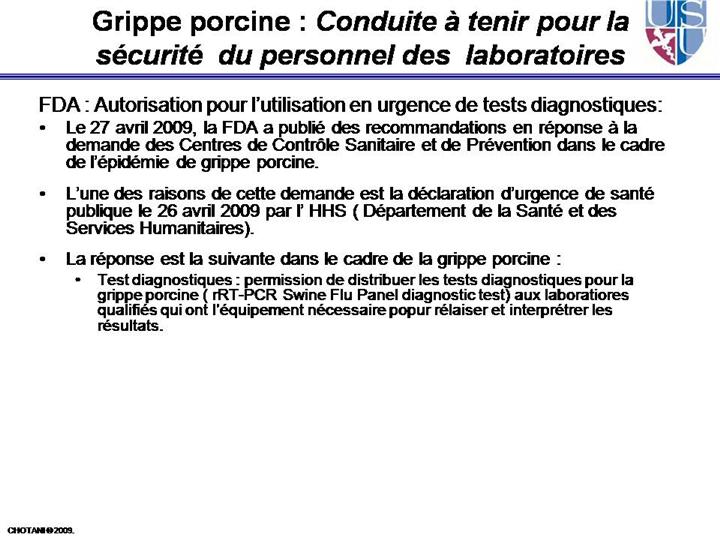 | La FDA autorise l’utilisation en urgence des médicaments de la grippe et des tests diagnostiques en réponse à l’épidémie de grippe porcine chez l’homme. [news release]. Rockville, MD: U.S. Food and Drug Administration. April 27, 2009. http://www.fda.gov/bbs/topics/NEWS/2009/NEW02002.html. Accessed April 28, 2009.