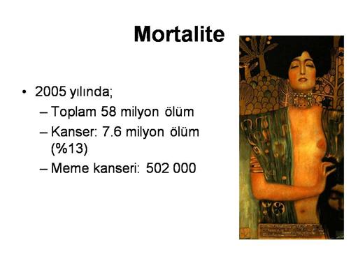 Dünyada meme kanserine bağlı mortalite ülkeden ülkeye değişmektedir. 2000 yılı için tahmin edilen değerlere göre İzlanda yüzbinde 36.8 ile ilk sıradadır. Meme kanserine bağlı ölüm hızının en düşük olduğu ülke ise Güney Kore’dir. Daha sonra sırası ile Çin, Çad, Tayland ve Japonya gelmektedir. |