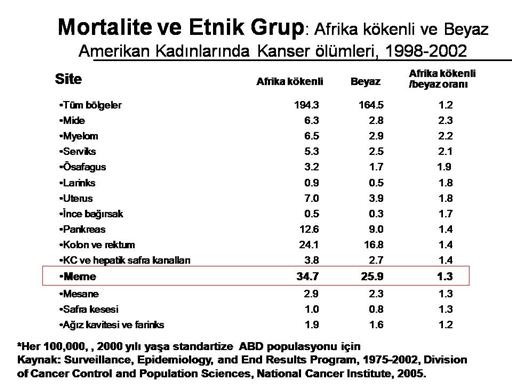 Death rates for female breast and colorectal cancers were approximately equal between whites and blacks around 1980. Subsequently, the gap in mortality widened over time, so that in 2000 the female breast and colorectal cancers were 32% and 30% higher in blacks than in whites, respectively. These trends occurred during a period of substantial improvement in early detection and treatment for breast and colorectal cancers. Historically, the use of mammography, which has contributed to reduction in deaths from breast cancer, has been lower in black women than in white women, although the rate has become comparable more recently.32 There is also some evidence that black women are less likely than white women to receive radiation therapy after breast-conserving surgery,33,34 a regimen that is known to improve survival.35 The diverging trends in mortality suggest that not all segments of the population have benefited equally from medical advances. Göç eden insanlarda saptanan, zaman içinde meme kanserine bağlı mortalite hızındaki değişiklik meme kanseri oluşumunda çevresel faktörlerin ve yaşam tarzının önemli faktörler olduğu görüşünü desteklemektedir. ABD’de ve Hawai’de yaşayan Japonlarda meme kanserine bağlı mortalitenin, Japonya’da yaşayan Japonlara göre; ABD’de doğan Japonlardaki mortalitenin de Japonya’da doğan ve ABD’de yaşayan Japonlara göre daha yüksek olduğu gösterilmiştir 1998-2002; ABD, Mortalite Yüzbin kadında; Genel: 26.4 Beyaz: 25.9 Siyah: 34.7 Asya kökenli: 12.7 Yerli: 13.8 Latin: 16.7 |