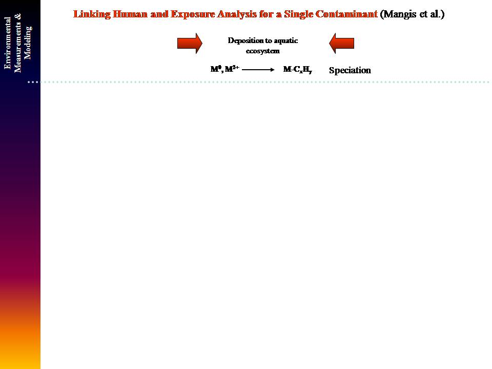 For human mercury exposure, this slide illustrates some of the issues and uncertainties related to dietary mercury exposure and dose modeling. Most of the emphasis is from the fish concentration on. For ecosystem studies, the uncertainties are mainly from the source to the fish. |