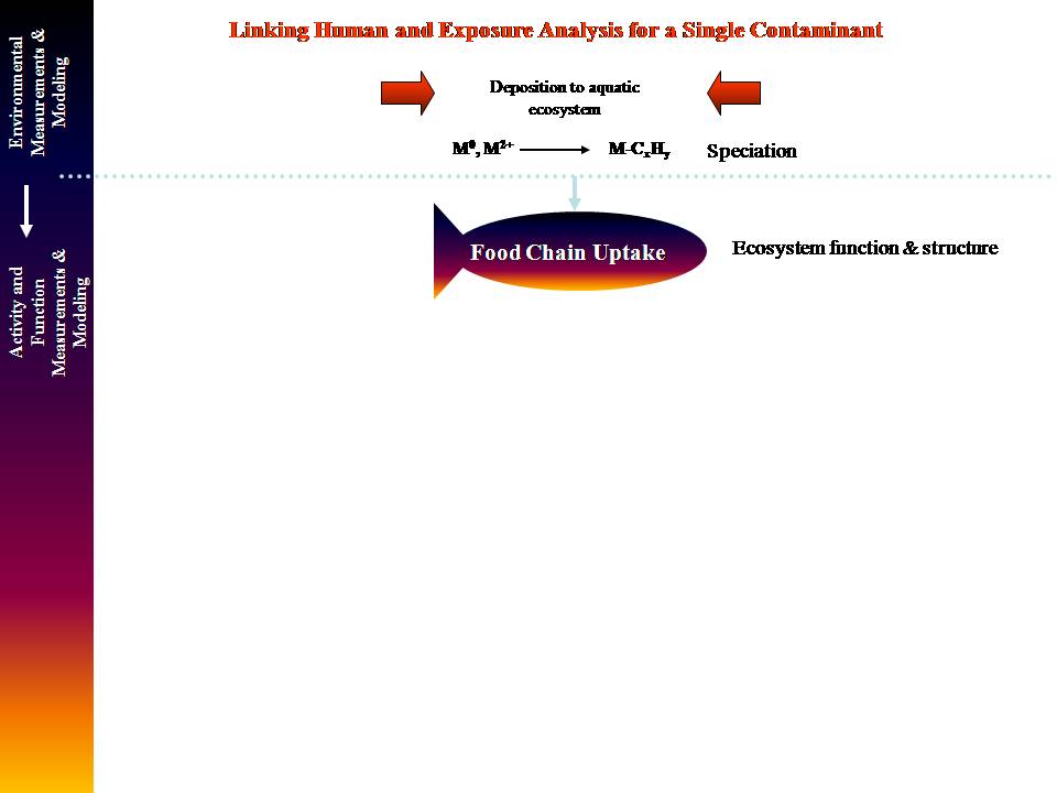 For human mercury exposure, this slide illustrates some of the issues and uncertainties related to dietary mercury exposure and dose modeling. Most of the emphasis is from the fish concentration on. For ecosystem studies, the uncertainties are mainly from the source to the fish. |