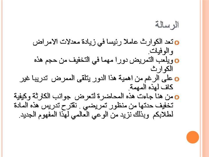 لى مدى العقود القليلة الماضية والكوارث في ازدياد. بالتالي الملايين من الناس قد تضررت وفقدوا أفراد اسرهم ومنازلهم .من الامور المتفق عليها ان لا أحد محصن ضد الكوارث. ومع ذلك يمكن للاستعداد والتأهب ان يشكل فرقا في النتائج.يعد الممرضون أكبر مجموعة مهنية في الرعاية الصحية ، ومع ذلك ، فإنهم ليسو مستعدين تماما لمواجهة الكوارث.حيث تشكل الكوارث تشكل تهديدا ماديا ,نفسيا واجتماعيا على المجتمع. ونظرا لنظرة التمريض للصحة بأنها حالة من المعافاة الجسدية والنفسية. لهذا تلقي التمريض التدريب في مجال الكوارث يمكن أن يسهم كثيرا في التخفيف من آثار الكوارث في كل من المنطقة المتضررة وكذلك جميع أنحاء البلاد. من هنا جاءت هذه المحاضرة التي تهدف الى توفير المعلومات الأساسية عن الكوارث ووصف دور التمريض في مجال إدارة الكوارث على ثلاثة مستويات من الوقاية. هناك الملايين من الممرضين ، و الآلاف من مدارس التمريض التي لا تدرس موادا تتعلق بالكوارث ، خصوصا في الأماكن التي تتعرض لكوارث طبيعية مستمرة.حيث ان المدرسين في هذه البلدان بحاجة إلى المواد التعليمية وفنون إدارة الكوارث.من هنا جاء“سوبر كورس“ كنموذج سيعمل على تطوير المعلمين وأعضاء هيئة التدريس في مدارس التمريض وفي جميع أنحاء العالم من خلال تزويدهم بمادة علمية محدثة وجاهزة للتدريس على شكل محاضرات تتعلق بإدارة الكوارث. |