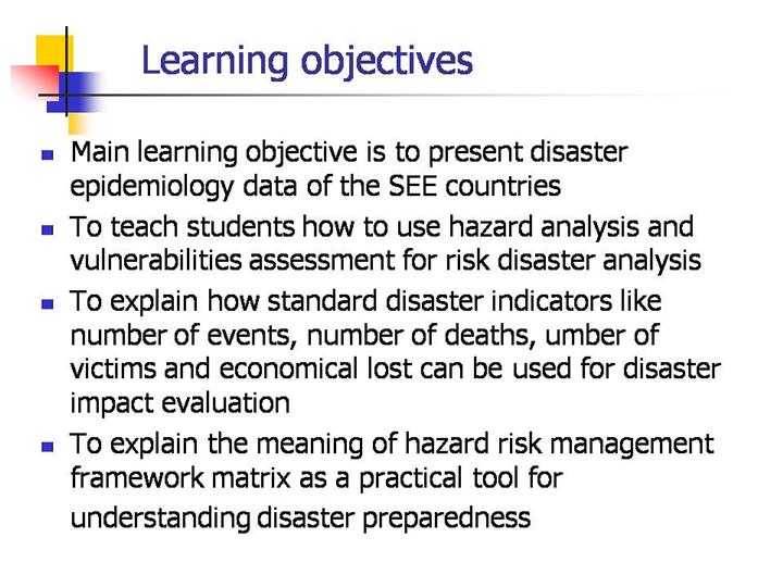 The main objectives of this lecture are to make review of assessed risks for selected SEE countries – Albania, Bosnia and Herzegovina, Bulgaria, Croatia, Macedonia, Serbia and Montenegro (by alphabetical order) and their common vulnerabilities; to review existing capacities; and to identify needs, means of cooperation, education and training and investment priorities to promote preparedness and to upgrade emergency response capabilities. |