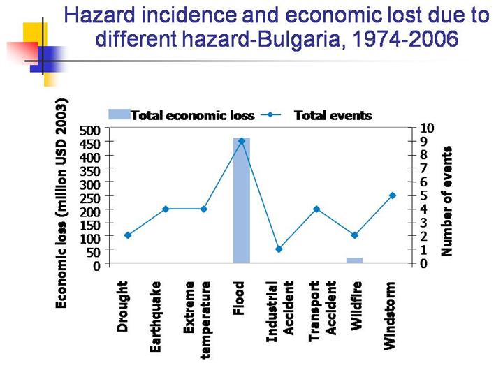 The reports show economic losses of USD 477 million due to flood and wind, with flood contributing the major share. The National Geophysical Data Center reports that the country has incurred a loss of USD 5 million due to earthquake during the last 33 years. This economic loss equals about 0.3 per cent of the country’s GDP (USD 14.76 million). |