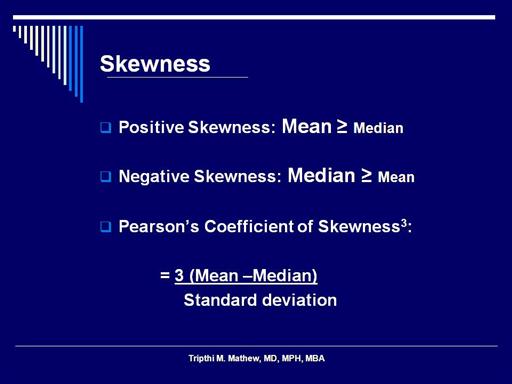 As I mentioned earlier the Mean = Median in the normal distribution curve. However, when the Mean is greater than the median there is a positive skewness (that is the tail is to the right) to the normal distribution curve. And when the Median is greater then the mean, the tail is skewed to the left, that there is negative skewness. The skewness can be calculated using the Pearson’s Coefficient of Skewness. |