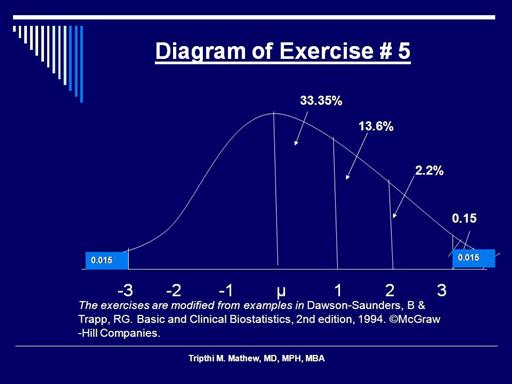 In this question, we need to calculate Z1 and Z2. Therefore, Z1 =70-40/10, which is equal to 3. The z value of 3 is 0.015. Similarly, the value of Z2 is 70-100/10 which is equal to -3. Thus, the value of z is 0.015 And so, Z1+Z2 is equal to 0.3%. But how do we interpret this value? Please see the solution/answer #5 slide for its interpretation. |