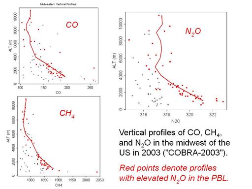 all the high N2O points have high CO, some high CO points don't seem to have elevated N2O.