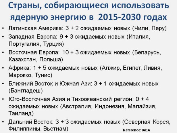 Будущее отрасли Всего около 21 новой страны собираются использовать ядерную энергию в 2015-2030 годах. Diablo Canyon Power Plant в округе Сан-Луис-Обиспо, штат Калифорния, США В 2007 году, Watts Bar 1, который вышел на линию 7 февраля 1996, был последним американских коммерческих ядерным реактором. Это часто цитируют в качестве доказательства всемирной кампании по отказу от ядерной энергии. Тем не менее, даже в США и во всей Европе, инвестиции в исследования и в ядерно-топливного цикла nuclear fuel cycle продолжаются, и некоторые эксперты по ядерным вопросам промышленности предсказывают недостаток электроэнергии electricity shortages, ископаемое топлива растет в цене, global warming глобальное потепление и выбросы тяжелых металлов в результате использования ископаемого топлива увеличиваются, приходят новые технологии, такие как passively safe пассивно безопасные станции, и национальная энергетическая безопасность требует возобновления спроса на атомные электростанции.