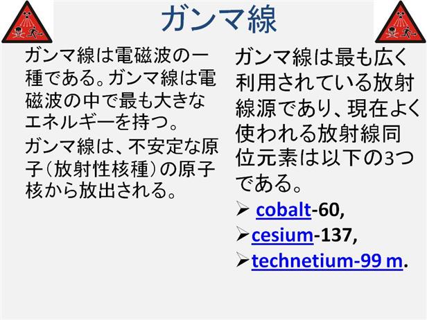 The properties of gamma radiation. Gamma radiation is very high-energy ionizing radiation. Gamma photons have about 10,000 times as much energy as the photons in the visible range of the electromagnetic spectrum. Gamma photons have no mass and no electrical charge--they are pure electromagnetic energy. Because of their high energy, gamma photons travel at the speed of light and can cover hundreds to thousands of meters in air before spending their energy. They can pass through many kinds of materials, including human tissue. Very dense materials, such as lead, are commonly used as shielding to slow or stop gamma photons. Their wave lengths are so short that they must be measured in nanometers, billionths of a meter. They range from 3/100ths to 3/1,000ths of a nanometer. Gamma rays and x-rays, like visible, infrared, and ultraviolet light, are part of the electromagnetic spectrum. While gamma rays and x-rays pose the same kind of hazard, they differ in their origin. Gamma rays originate in the nucleus. X-rays originate in the electron fields surrounding the nucleus or are machine-produced. Health Effects of Gamma Radiation Because of the gamma ray's penetrating power and ability to travel great distances, it is considered the primary hazard to the general population during most radiological emergencies. In fact, when the term "radiation sickness" is used to describe the effects of large exposures in short time periods, the most severe damage almost certainly results from gamma radiation. Protecting People from Gamma Radiation You need specialized equipment to detect gamma radiation. You cannot see, or feel radiation hitting your body. However, you should be familiar with radiation warning symbols. You can protect yourself by avoiding devices with this symbol, and not entering areas where the symbol is posted. In February of 2007, the United Nations introduced a new symbol to help reduce accidental exposure to large radioactive sources. The new icon is aimed at alerting anyone, anywhere to the potential dangers of being close to a large source of ionizing radiation.
