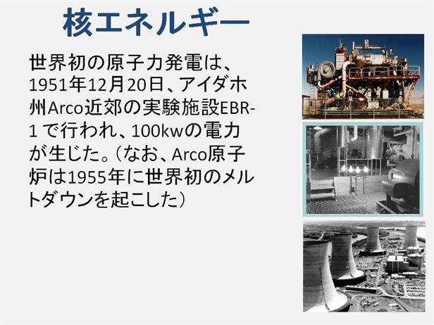 Electricity was generated for the first time by a nuclear reactor on December 20, 1951, at the EBR-I experimental station near Arco, Idaho, which initially produced about 100 kW (the Arco Reactor was also the first to experience partial meltdown, in 1955). In 1952, a report by the Paley Commission for President Harry Truman made a "relatively pessimistic" assessment of nuclear power, and called for "aggressive research in the whole field of solar energy.” A December 1953 speech by President Dwight Eisenhower, "Atoms for Peace," emphasized the useful harnessing of the atom and set the U.S. on a course of strong government support for international use of nuclear power. The idea behind the breeder is to maximize the useful energy that can be extracted from natural uranium. Inside a nuclear reactor, uranium-238 — the common form of the metal which cannot be used for fuel — can capture neutrons released during fission and transform into plutonium-239. This man-made element can fuel reactors, so breeding makes it possible to use virtually 100 percent of the energy in natural uranium. EBR-I provided the first proof that breeding is possible: On June 4, 1953, the U.S. Atomic Energy Commission announced that EBR-I had become the world's first reactor to demonstrate the breeding of plutonium from uranium. http://en.wikipedia.org/wiki/Nuclear_power#History