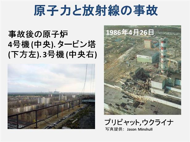 原子力や放射線の事故にはさまざまな種類がある。 最悪の原発事故は1986年にウクライナのキエフKiev, Ukraine.で発生したチェルノブイリ原発事故 Chernobyl disasterである。 事故による放射性降下物はベラルーシ、ウクライナ、ロシアの近くに集中し、少なくとも350,000人が強制的にこれらの地域から移住しなければならなくなった。 事故の後、“チェルノブイリ特有の放射性物質はほぼすべての北半球の国で発見された。 空中に飛散した浮遊物は旧ソ連、東欧、西欧、北ヨーロッパSoviet Union, Eastern Europe, Western Europe, and Northern Europe.の大部分に漂った。雨も放射性物質で汚染され、遠くアイルランド Ireland.まで被害が拡大した。 ウクライナ、ベラルーシUkraine,Belarus,の大部分、ロシアRussiaは、ひどく汚染され、結果、住民の336000人以上が避難し移住を強いられた。