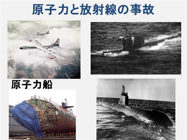 .原子力事故は、制御不能の連鎖反応が起きた場合の”制御不能による事故”と、”冷却液の事故”とに分類される。 ソ連原子力潜水艦が操業していた全期間中で、10件の原子力事故が発生し、うち1つは1970年のK - 329の建設中、チャーリー- Iクラスの船で発生した。 K - 11とK – 431の燃料を補給中に2つの事故が起き、また造船所(K - 140)の原子炉修理中、潜水艦(K - 222)の修理中、4つの事故は海上での運航中に、もう1つは原子炉(K - 314)がシャットダウンした。 2つの事故は太平洋艦隊の潜水艦で、7つの事故は北方艦隊で、1つはニジニ・ノーヴゴロトの造船所で起きた。 下記の米国の核兵器を積んだ飛行機事故は、ニュージャージー州のアトランティックシティ、Atlantic City, New Jersey(1957年)の近く、サバンナ、ジョージアSavannah, Georgia(1958年)(ティビー爆弾Tybee Bombを参照)。ゴールズボロ、ノースカロライナ州Goldsboro, North Carolina(1961)、沖縄Okinawaの海岸(1965)、スペインのパロマレス付近の海上Palomares, Spain (1966年)(1966年パロマレスのB – 52の衝突1966 Palomares B-52 crash)と、グリーンランドのトゥーレ Thule, Greenlandの近く(1968年)(1968年トゥーレ空軍基地のB - 52クラッシュを参照1968 Thule Air Base B-52 crash)で起きた。