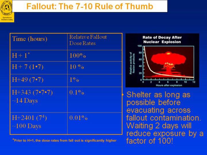 Time The mixture of radionuclides in the fission products formed after a nuclear detonation is so complex that it is not possible to represent their decay in terms of a single half-life. However, it has been found that for every sevenfold increase in time after a nuclear explosion, the relative activity decreases by a factor of ten. As shown, 1 hour after detonation is used as a reference point and assigned a relative activity of 100 percent. At 7 hours after detonation, the relative activity decreases to 10 percent. If this curve were extended, it would show that, at 49 (7x7) hours after detonation, the relative activity decreases to 1 percent and that, at 2 weeks (7x7x7 hours), it is 1/10 of 1 percent. |