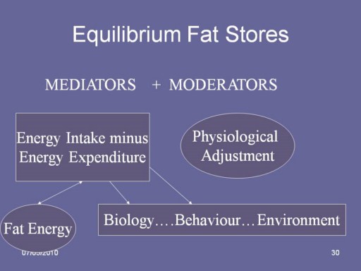 The amount of fat in our fat stores depends on the laws of physics but there are a series of interacting and complex mediators and moderators involving complex humoral and neural interactions |