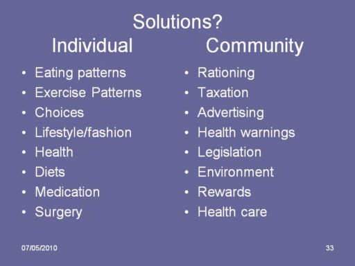 At a population level Prevention Primary-Breast feeding, Child Care,Education Secondary-Monitor, advise, intervene early Tertiary-Established and funded health care Quarternary-Catering for fat people in society