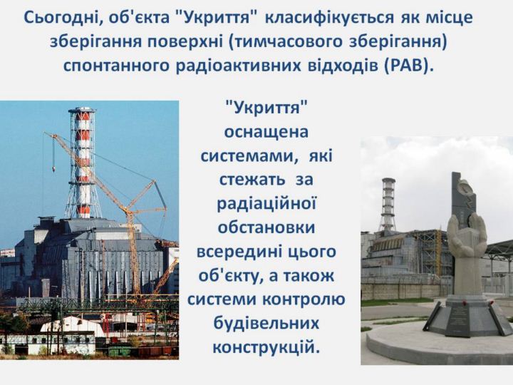 На даний момент "Укриття" оснащена системами, які стежать за радіаційної обстановки всередині цього об'єкту, а також системи контролю будівельних конструкцій. Слід зазначити, що об'єкт "Укриття" є не тільки знищив реактор Чорнобильської атомної електростанції . Відповідно до об'єкта "Укриття" означає: знищено Блок B другому етапі Чорнобиля - четвертий блок; споруд, побудованих навколо зруйнованого реактора, де-аератор, а що ні машинного залу, частина блоку B, частина блоку, склад Об'єкт "Укриття" також включає в себе місцевий області, яка території, прилеглої до об'єкта - захисної зони, яка обладнана системами моніторингу і спостереження. структуру житла системи, і включає в себе елементи, призначені для виконання робіт з підтримання об'єкта в безпечний стан.? Тобто, в цей час житло зруйновано важкої аварії 4-й блок Чорнобильської АЕС, який втратив всі функціональні можливості пристрою і за якими реалізація пріоритетних заходів щодо зменшення наслідків аварії і які продовжують щодо забезпечення ядерної та радіаційної безпеки. Поточні заходи на об'єкті "Укриття", щоб забезпечити захист для Чорнобильської АЕС, зони відчуження персоналу, населення і навколишнього середовища від радіаційної небезпеки, що обумовлено наявністю житла ядерних і радіаційно-небезпечних матеріалів?. Більш детальну інформацію про стан об'єкта "Укриття" Ви можете знайти тут - http://www.ibrae.ac.ru/~lgis/sg/index.html.