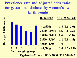| In a report from the Medical Birth Registry of Norway, women's own birth weight was inversely related to their later risk for gestational diabetes. The U-shaped curve presented here has been identified in other studies and is most likely attributed to the increased birth weight and increased diabetes risk of offspring of diabetic mothers. |