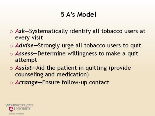 To receive training on the 5 A’s model click on this link: http://rxforchange.ucsf.edu/. Section 5 of the course provides training on treating tobacco dependence using the 5 A’s |